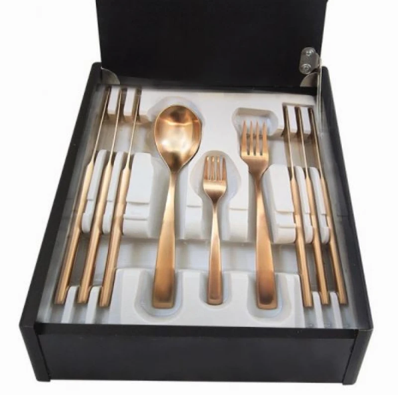 Μαχαιροπήρουνα σετ 30 τεμαχίων ανοξείδωτα σε ξύλινο κουτί, ισπανικής προέλευσης. Το σετ αποτελείται από: 6 πηρούνια φαγητού, 6 κουτάλια φαγητού, 6 μαχαίρια φαγητού, 6 κουτάλια γλυκού, 6 πηρούνια γλυκού.