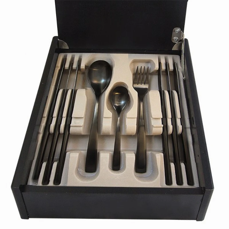Μαχαιροπήρουνα σετ 30 τεμαχίων ανοξείδωτα σε ξύλινο κουτί, ισπανικής προέλευσης. Το σετ αποτελείται από: 6 πηρούνια φαγητού, 6 κουτάλια φαγητού, 6 μαχαίρια φαγητού, 6 κουτάλια γλυκού, 6 πηρούνια γλυκού.