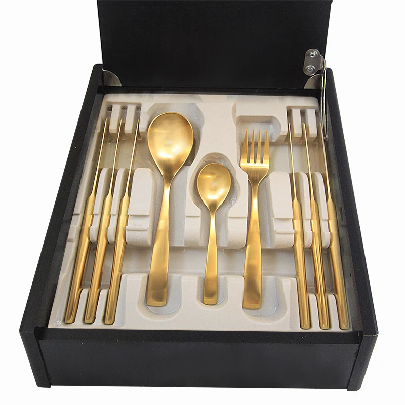 Μαχαιροπήρουνα σετ 30 τεμαχίων ανοξείδωτα σε ξύλινο κουτί, ισπανικής προέλευσης. Το σετ αποτελείται από: 6 πηρούνια φαγητού, 6 κουτάλια φαγητού, 6 μαχαίρια φαγητού, 6 κουτάλια γλυκού, 6 πηρούνια γλυκού.