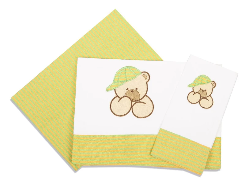 Σετ σεντόνια μπεμπέ 100% βαμβάκι περκάλι,144 κλωστών με κέντημα και φάσα σε λαχανί - λευκό χρώμα με πορτοκαλί ριγες Αρκούδος 100 από την Dimcol. Το σετ περιλαμβάνει: 2 σεντόνια 120x170εκ. και 1 μαξιλαροθήκη 30x40εκ.