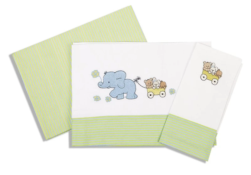 Σετ σεντόνια μπεμπέ 100% βαμβάκι περκάλι,144 κλωστών με κέντημα και φάσα σε λευκό χρώμα με λαχανί - γκρι ρίγες Ελεφαντάκια 111 από την Dim Collection. Το σετ περιλαμβάνει: 2 σεντόνια 120x170εκ. και 1 μαξιλαροθήκη 30x40εκ.