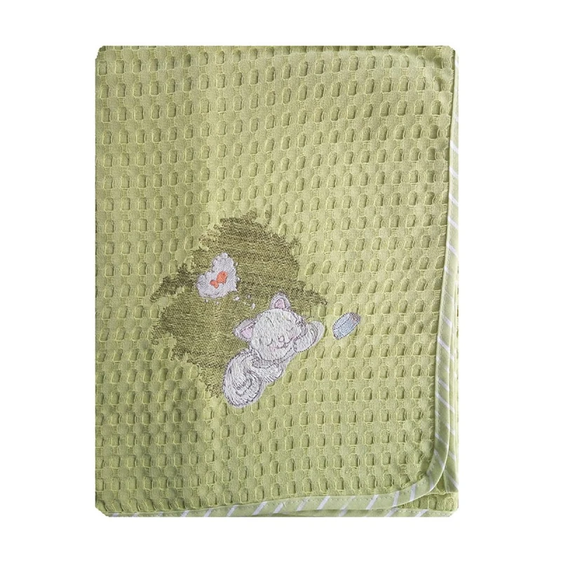Κουβέρτα αγκαλιάς πικέ, 100% βαμβακερή, ιδιαίτερα απάλη με χαρούμενα κεντήματα και ρέλι σε λαχανί χρώμα Γατάκι 128 από την Dim Collection - Διαστάσεις: 80x110εκ.