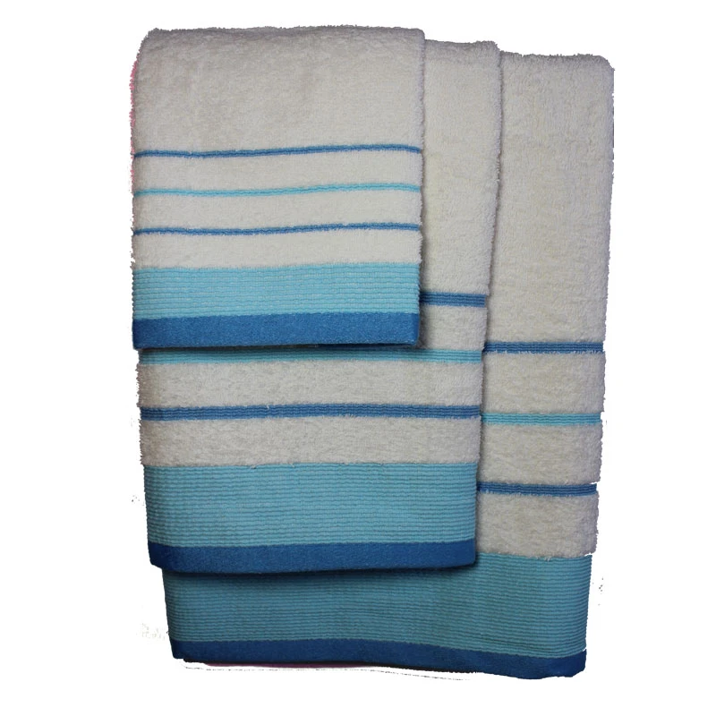 Σετ πετσέτες 3τμχ 100% βαμβακερές Raya σε εκρού - τυρκουάζ χρώμα με σχέδιο ρίγα από το 24home.gr. Το σετ περιλαμβάνει: 1 πετσέτα μπάνιου 75x145εκ., 1 πετσέτα προσώπου 50x90εκ., 1 πετσέτα χεριών 30x50εκ.