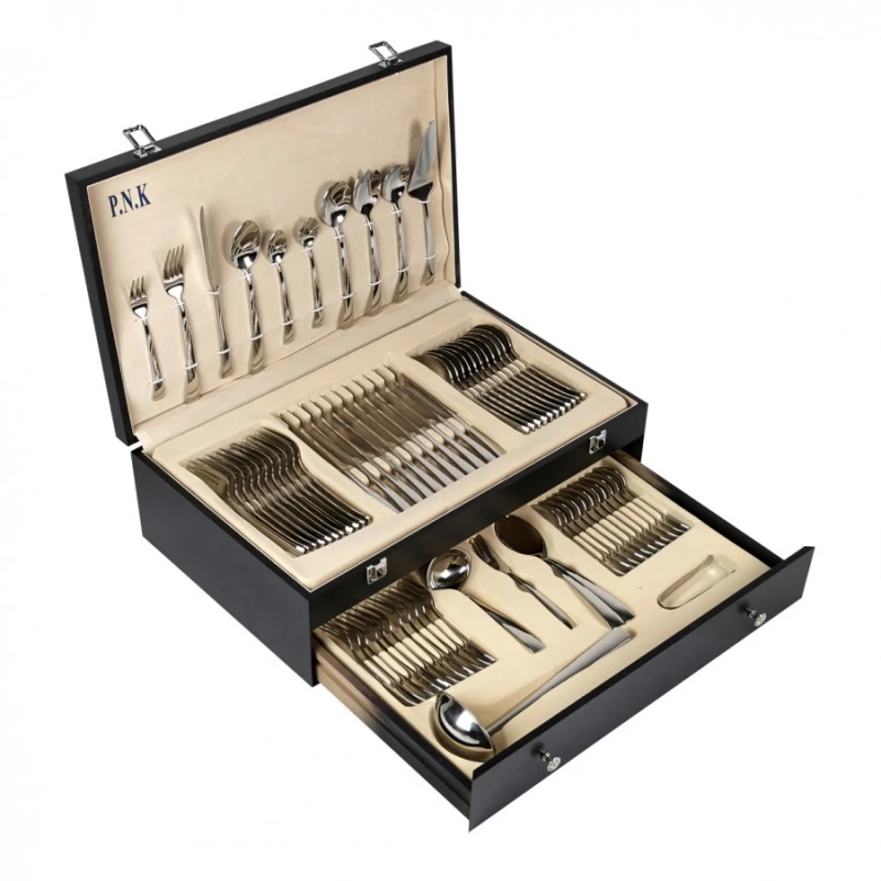 Μαχαιροπήρουνα ανοξείδωτα 18/10 σε βαλίτσα σετ 72 τεμαχίων σε ασημί χρώμα από την WM Collection. Το σετ αποτελείται από: 12 πηρούνια, 12 κουτάλια, 12 μαχαίρια, 12 πηρούνια γλυκού, 12 κουτάλια γλυκού, 1 κουτάλα σούπας, 1 κουτάλα σάλτας, 2 πιρούνια τυριού, 2 κουτάλες σαλάτας, 1 σετ ζυμαρικών, 1 σπάτουλα, 1 κουταλάκι ζάχαρης, 1 τσιμπίδα και 2 κουταλάκια τυριού.