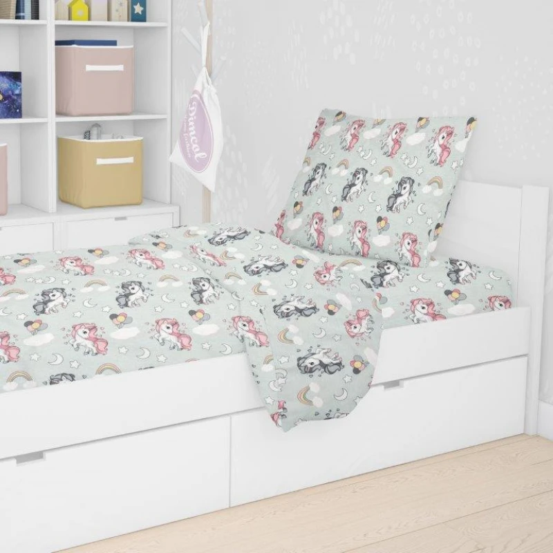 Σετ σεντόνια μονά 2 τμχ εμπριμέ, 100% βαμβακερά, 144 κλωστών με σχέδιο μονόκερος σε πράσινο χρώμα από την Dimcol. Το σετ περιλαμβάνει: 1 σεντόνι flat 160x240εκ. και 1 μαξιλαροθήκη 50x70εκ.