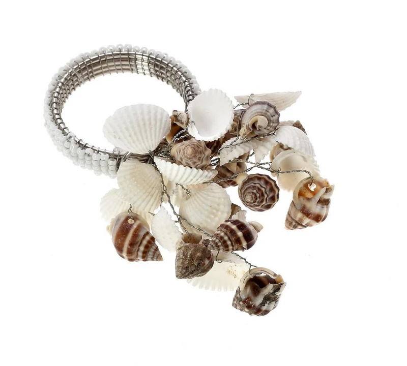 Δαχτυλίδι πετσέτας μεταλλικό σε λευκό - μπεζ χρώμα διακοσμημένο με κοχύλια από την ESPIEL - Διαστάσεις: 6,45x6,43εκ. - Η ελάχιστη ποσότητα αγοράς για αυτό το προϊόν είναι 6τμχ.