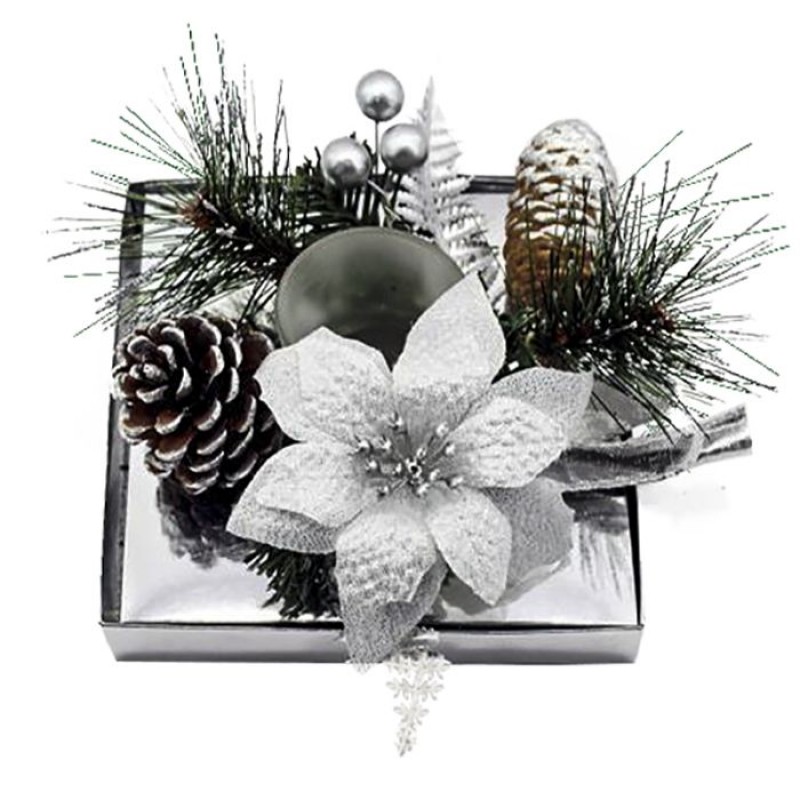 Χριστουγεννιάτικο κηροπήγιο με κλωνάρια σε ασημί χρώμα από την Xmas fest - Διαστάσεις: 9x15εκ.