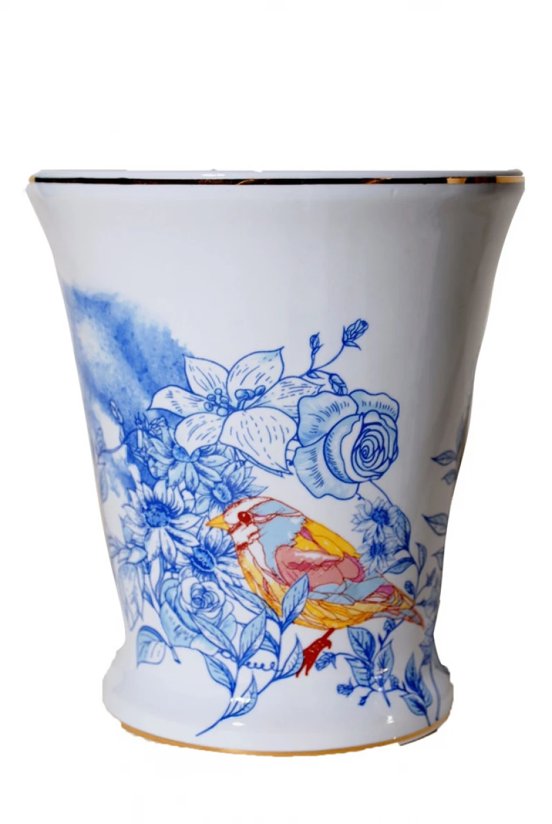 Βάζο πορσελάνης σε λευκό χρώμα με σχέδιο μπλε λουλούδια και πολύχρωμο πουλάκι από την Royal Art - Διάσταση: 19εκ.