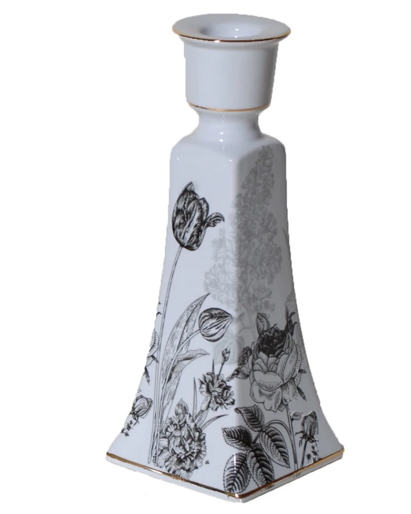 Κηροπήγειο πορσελάνης σε λευκό χρώμα με διακόσμηση μαύρα λουλούδια και τελείωμα χρυσού από την Royal Art - Διάσταση: 20εκ.