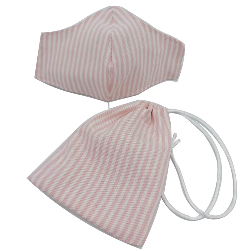Μάσκα προσώπου από 100% βαμβακερό διπλό ύφασμα με ασορτί πουγκί φύλαξης. Ριγέ ροζ - λευκό εξωτερικά με και λευκό εσωτερικά. Πολλαπλών χρήσεων. Πλενόμενη.
