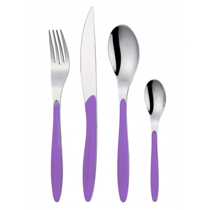 Σετ μαχαιροπήρουνα 24τμχ ανοξείδωτα με χρωματιστή λαβή σε μωβ χρώμα της σειράς Hoop από την CRYSPO TRIO. Το σετ περιλαμβάνει: 6 μαχαίρια φαγητού, 6 κουτάλια φαγητού, 6 πηρούνια φαγητού και 6 κουταλάκια γλυκού.