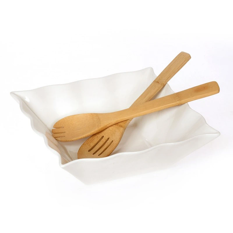 Σαλατιέρα πορσελάνης με σετ κουτάλες bamboo σε λευκό χρώμα της σειράς Durable από την CRYSPO TRIO - Διαστάσεις: 28x10εκ.