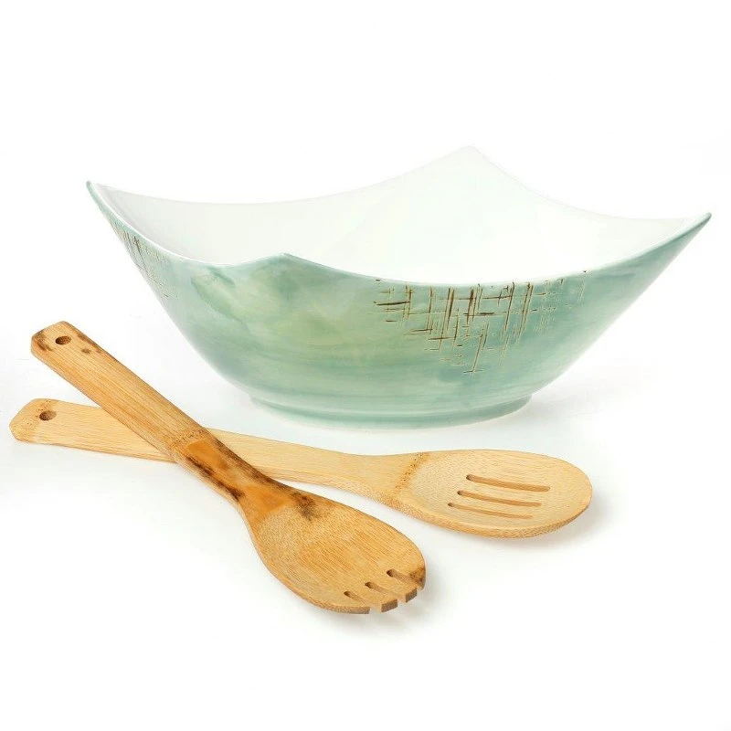 Σαλατιέρα πορσελάνης τετράγωνη σε πράσινο χρώμα με σετ κουτάλες bamboo της σειράς Country από την CRYSPO TRIO - Διαστάσεις: 25εκ.