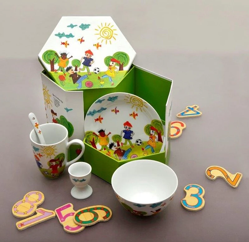 Παιδικό σετ φαγητού 5τμχ πορσελάνης με σχέδιο παιδιά που παίζουν ποδόσφαιρο από την CRYSPO TRIO - Το σετ περιλαμβάνει: πιάτο φαγητού, μπωλ, αυγοθήκη, κουτάλι, κούπα.