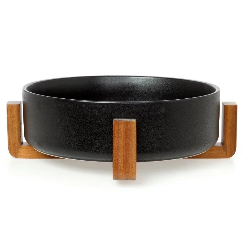 Σαλατιέρα σε μαύρο χρώμα crystal glaze porcelain με βάση από ξύλο ακακίας από την CRYSPO TRIO - Διαστάσεις: 31,5x8εκ.