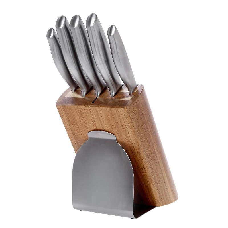Σετ 5τμχ μαχαίρια ανοξείδωτα με βάση από ξύλο ακακίας της σειράς Soul Kitchen από την CRYSPO TRIO - Διαστάσεις: 14x6,5x21εκ. - Το σετ περιλαμβάνει: 1 μαχαίρι σεφ 20 εκ., 1 μαχαίρι ψωμιού 20 εκ., 1 μαχαίρι ξεκοκαλίσματος 20 εκ., 1 μαχαίρι γενικής χρήσης 15 εκ. και 1 μαχαίρι ξεφλουδίσματος 9 εκ.