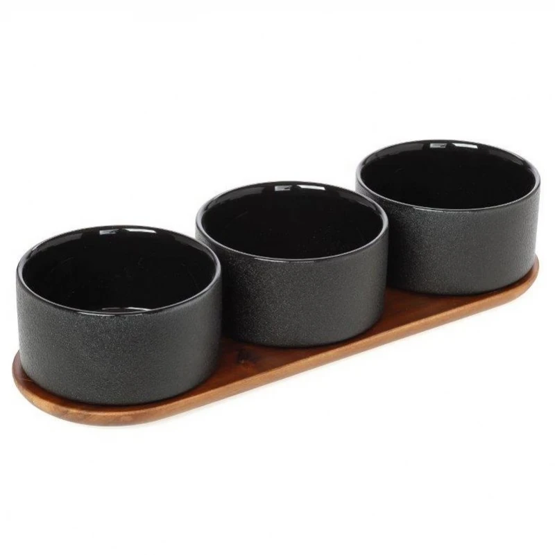 Σετ μπωλάκι - ντιπ σερβιρίσματος 3 θέσεων σε μαύρο χρώμα crystal glaze porcelain με βάση από ξύλο ακακίας από την CRYSPO TRIO - Διαστάσεις: 39,5x13εκ.