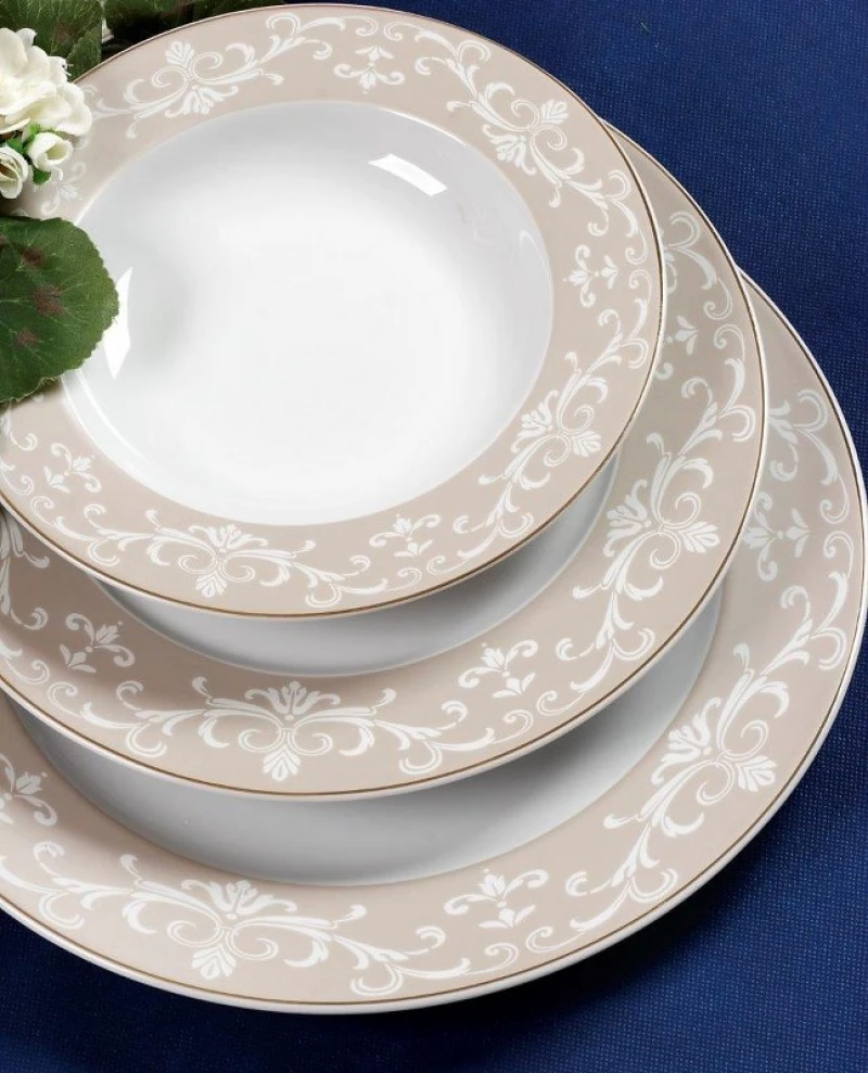 Σερβίτσιο πιάτων 20 τεμαχίων από πορσελάνη της σειράς Charlotte Oro από την CRYSPO TRIO. Το σετ περιλαμβάνει: 6 Ρηχά, 6 Βαθιά, 6 Φρούτου, 1 Σαλατιέρα, 1 Πιατέλα.