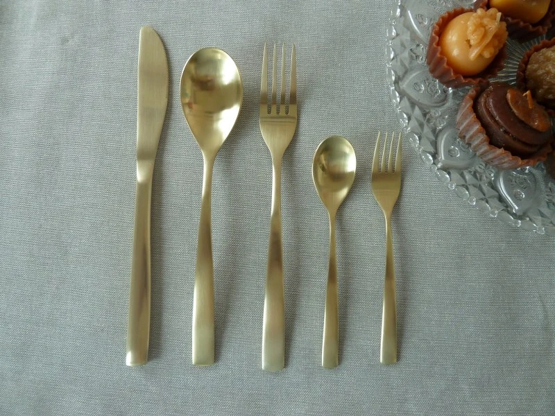 Μαχαιροπήρουνα σετ 30 τεμαχίων ανοξείδωτα 18/0 σε σαμπανί χρώμα ηλεκτροστατικά βαμμένα σε ξύλινο κουτί, ισπανικής προέλευσης. Το σετ αποτελείται από: 6 πηρούνια φαγητού, 6 κουτάλια φαγητού, 6 μαχαίρια φαγητού, 6 κουτάλια γλυκού, 6 πηρούνια γλυκού.