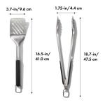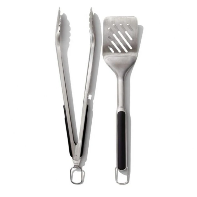 Σετ ψησίματος λαβίδα και σπάτουλα από ανοξείδωτο ατσάλι.Η σπάτουλα διαθέτει φαρδιά και λοξή λαβή ιδανική για να ολισθαίνει κάτω από τα μπιφτέκια. Η λαβίδα περιέχει και ενσωματωμένο ανοιχτήρι. Οι πολύ μεγάλες λαβές κρατούν τα χέρια μακριά από τη θερμότητα και τη φλόγα. Κατάλληλες για πλυντήριο πιάτων από την Oxo - Διαστάσεις: 47εκ., 41εκ.