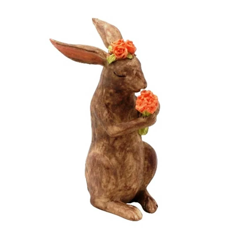 Διακοσμητικό επιτραπέζιο κουνέλι polyester σε καφέ χρώμα με πορτοκαλί λουλούδια στο χέρι και στο κεφάλι από την Royal Art Collection - Διαστάσεις: 17,5εκ.