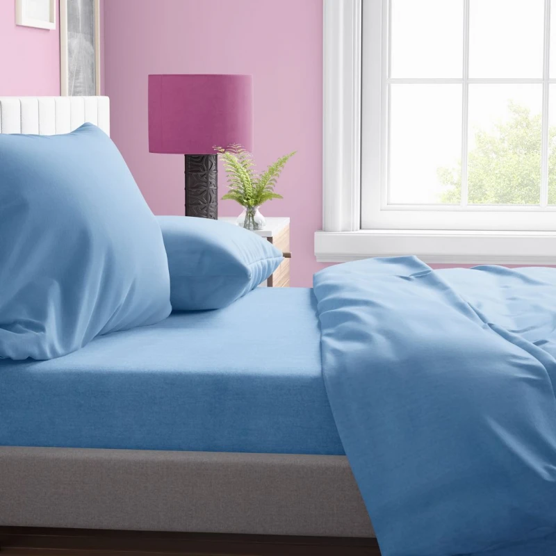 Σετ σεντόνια μονόχρωμα, υπέρδιπλα, 100% βαμβακερά, 144 κλωστών σε γαλάζιο χρώμα από την DimCol. Το σετ περιλαμβάνει: 2 σεντόνια 220x240εκ. και 2 μαξιλαροθήκες 50x70εκ.