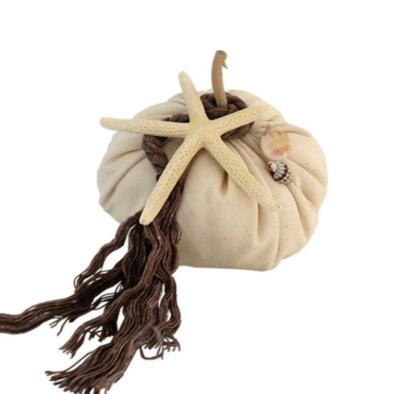 Διακοσμητική επιτραπέζια κολοκύθα λινή σε εκρού χρώμα με καλοκαιρινά σχέδια και καφέ λεπτομέρεια από την Art Et Lumiere - Διαστάσεις: 22εκ.