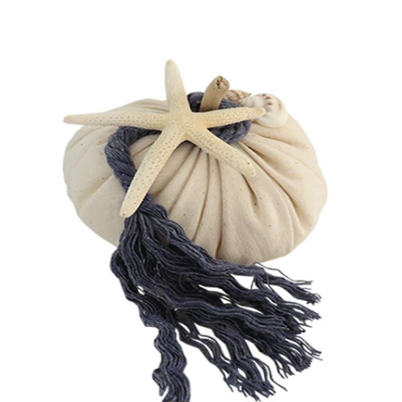 Διακοσμητική επιτραπέζια κολοκύθα λινή σε εκρού χρώμα με καλοκαιρινά σχέδια και μπλε λεπτομέρεια από την Art Et Lumiere - Διαστάσεις: 22εκ.