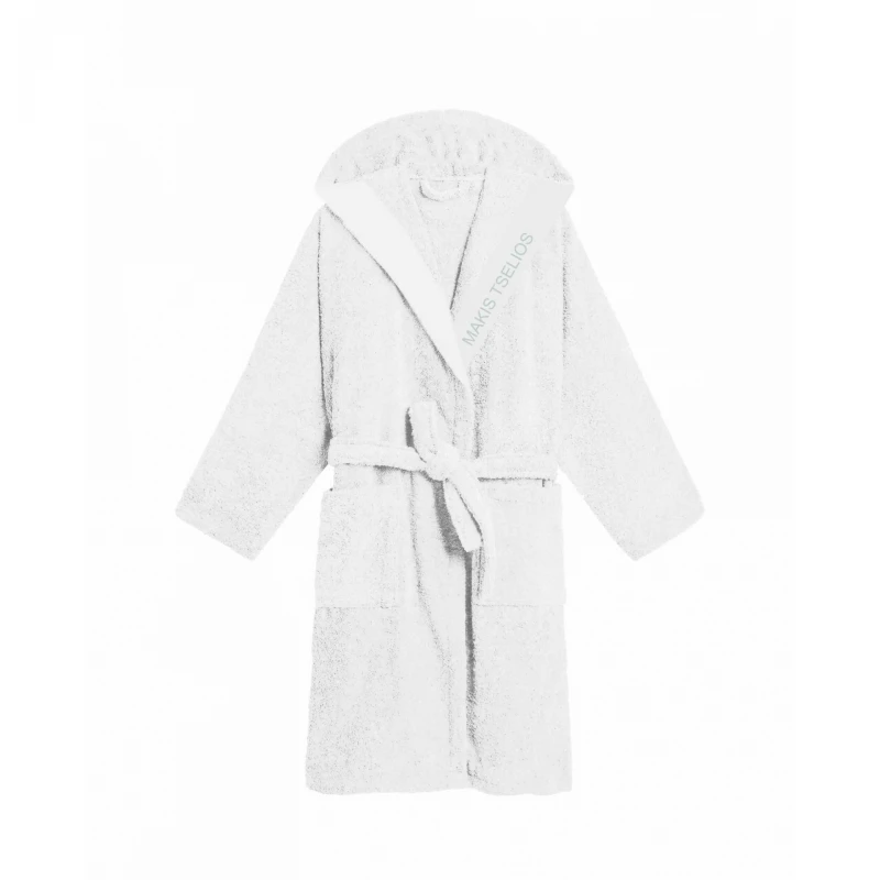 Μπουρνούζι ενηλίκων 100% βαμβακερό με κουκούλα, πλαινές τσέπες και κεντητό λογότυπο σε λευκό χρώμα της σειράς West από την εταιρεία Makis Tselios Home - Μέγεθος: Small.