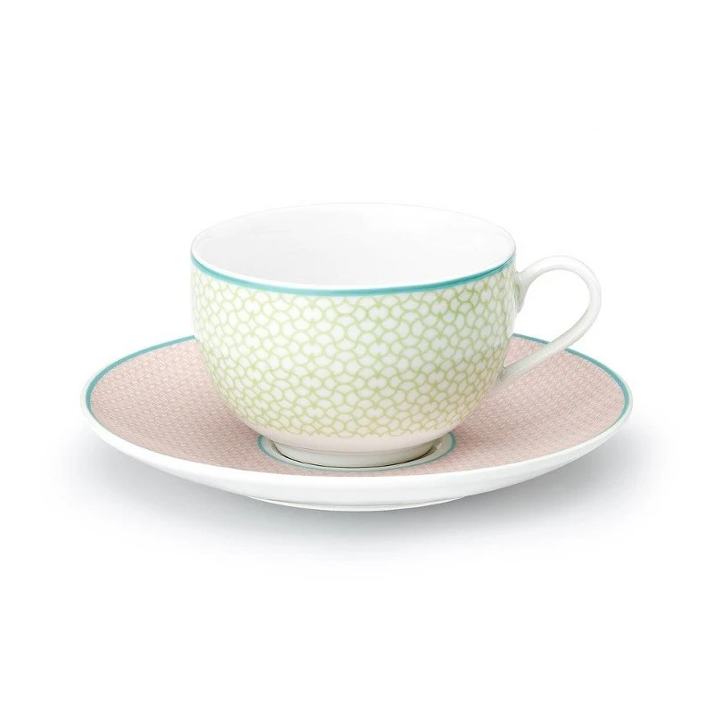Φλυτζάνι με πιατάκι τσαγιού πορσελάνης σε ροζ-λαχανί χρώμα της σειράς Siena από την CRYSPO TRIO - Χωρητικότητας: 220ml. - Η ελάχιστη ποσότητα αγοράς για αυτό το προϊόν είναι 6τμχ.