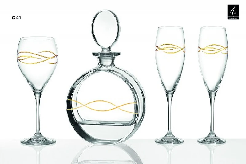Σετ γάμου 4τμχ από οικολογικό κρύσταλλο, με επίχρυση διακόσμηση από την Capolavoro - Το σετ περιλαμβάνει: 1 καράφα 650ml, 1 ποτήρι κρασιού και 2 ποτήρια σαμπάνιας.