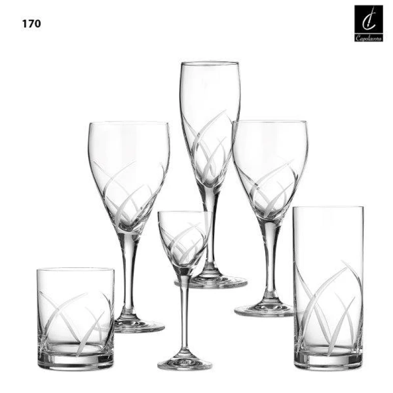 Σετ 36τμχ ποτήρια από οικολογικό κρύσταλλο, ταγιαρισμένα στο χέρι με διαμάντι της σειράς Rona από την Capolavoro - Το σετ περιλαμβάνει: 6 ποτήρια νερού κολωνάτα 360ml., 6 ποτήρια κρασιού 190ml., 6 ποτήρια λικέρ 60ml., 6 ποτήρια σαμπάνιας 230ml., 6 ποτήρια νερού σωλήνα 350ml., 6 ποτήρια ουίσκι 320ml.
