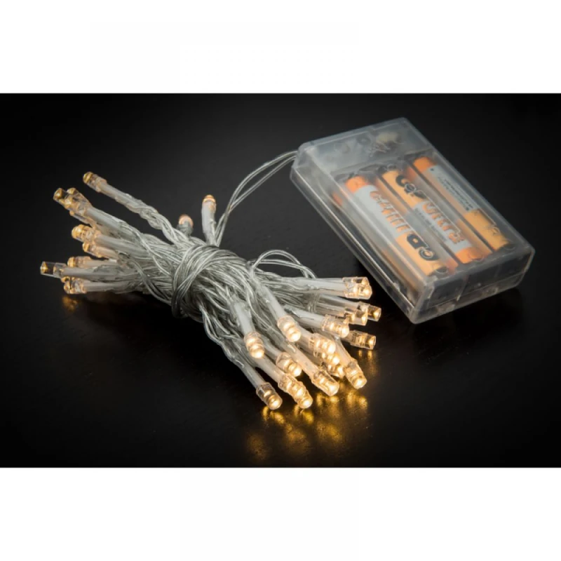 Μπαταρίας led με σταθερό φως. 40led, ανα 5εκ,μήκος 2 μέτρα. Διάφανο καλώδιο με ζεστό λευκό φως. Λειτουργεί με 3x2A μπαταρίες που ΔΕΝ περιέχονται. - Η ελάχιστη ποσότητα αγοράς για αυτό το προϊόν είναι 4τμχ.