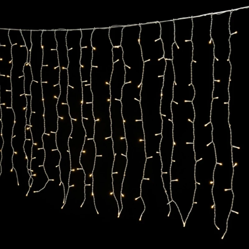 Λαμπάκια κουρτίνα 200 led, εσωτερικού και εξωτερικού χώρου και επεκτεινόμενη έως 3 φορές. Τα λαμπάκια είναι σε 20 γραμμές, ανα 10εκ, με 10 λαμπάκια η καθεμία. Μήκος 2 μέτρα και ύψος 1 μέτρο. Σταθερό λευκό φως με διάφανο καλώδιο. Συσκευασία σε πλαστικό διάφανο δοχείο με καπάκι.