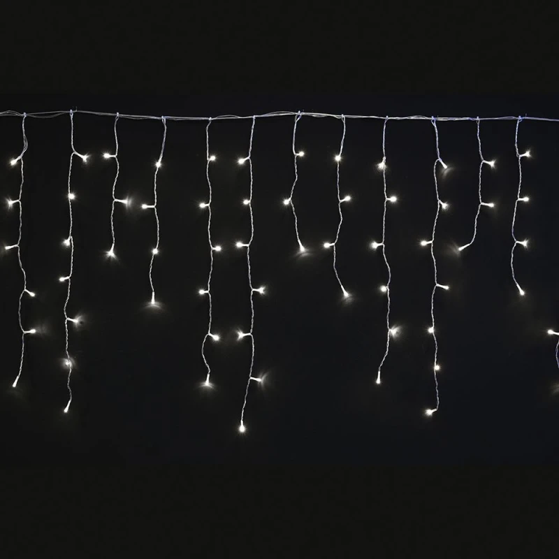 Λαμπάκια κουρτίνα σταλακτίτες 300 led, εσωτερικού και εξωτερικού χώρου με 8 προγράμματα. Αναβοσβήνει με λευκό φως και διάφανο καλώδιο. Μήκος 6 μέτρα +1,5 μέτρο για την μπρίζα και ύψος 70 εκατοστά. Συσκευασία σε πλαστικό διάφανο δοχείο με καπάκι.