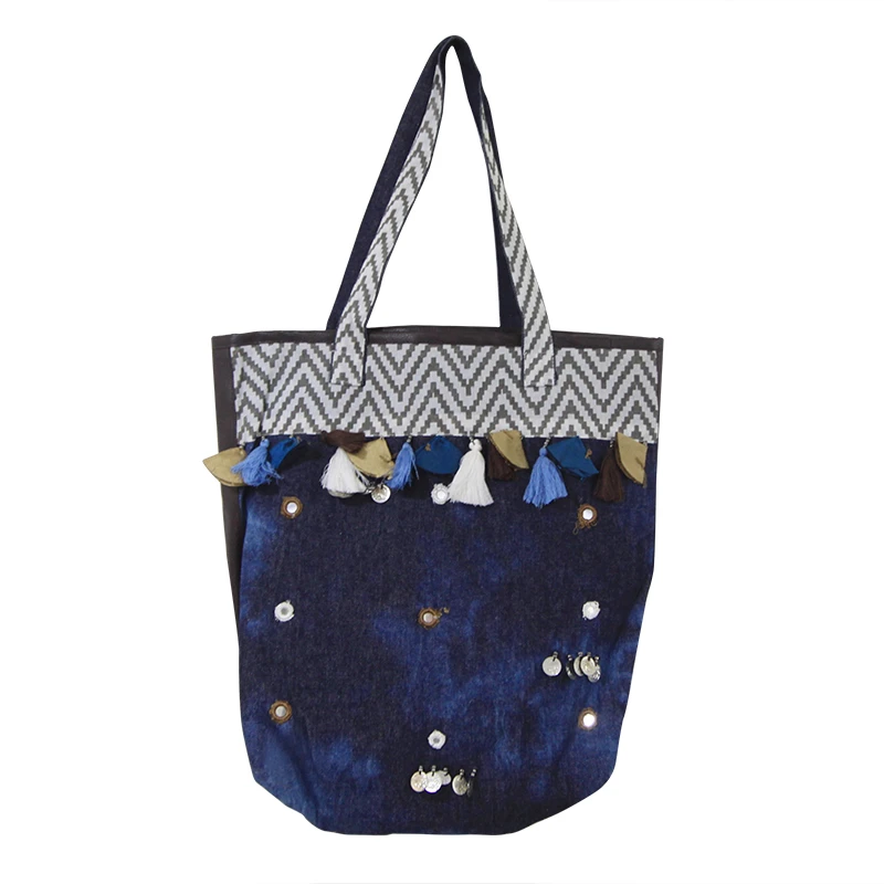 Τσάντα υφασμάτινη σε μπλε χρώμα με κούμπωμα, με μεταλλικές λεπτομέρειες και φούντες - Διαστάσεις: 36x8x44/68εκ.