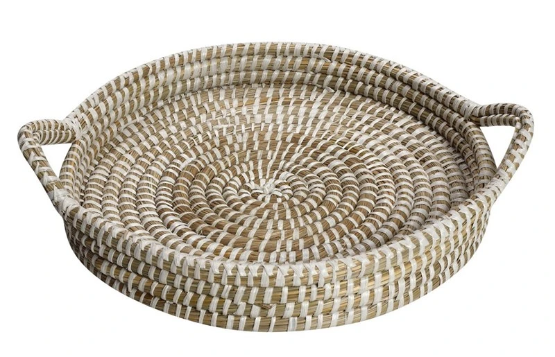 Δίσκος σερβιρίσματος στρογγυλός, ψάθινος με χερούλια σε λευκό - μπεζ χρώμα από την ESPIEL - Διαστάσεις: 40x6εκ.