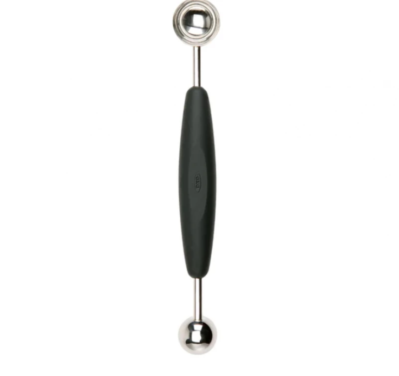 Εργαλείο αφαίρεσης Κουκουτσιών OXO. Οι δυο κεφαλές από ανοξείδωτο ατσάλι, σας δίνουν την επιλογή να "σκαλίσετε" το φρούτο δίνοντας τους σχήμα μπάλας στο μέγεθος που επιθυμείτε κάθε φορά. Κατάλληλο και για αφαίρεση κουκουτσιών για το μήλο ή το αχλάδι. Μαλακή και άνετη λαβή.