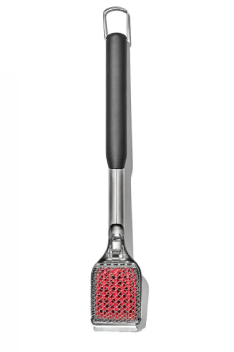 Το καθάρισμα μετά το ψήσιμο στη σχάρα δεν χρειάζεται να είναι αγγαρεία με την βούρτσα ψησταριάς χωρίς τρίχες με αντικαταστάσιμη κεφαλή. Δεν χρειάζεται να περιμένετε να κρυώσει τελείως η σχάρα πριν τη τρίψετε. Η ενσωματωμένη μεταλλική ξύστρα διαθέτει εγκοπές για να μετακινούνται γύρω από τις σχάρες της ψησταριάς για να ξύνουν τυχόν κολλημένα τρόφιμα. Το σώμα και η κεφαλή από ανοξείδωτο ατσάλι είναι ανθεκτικά στη θερμότητα για τον καθαρισμό ζεστών σχαρών, ενώ η γωνιακή κεφαλή και η μακριά, μαλακή λαβή επιτρέπουν τη χρήση χωρίς να χρειάζεται να πλησιάζετε πολύ τα χέρια σας στη ψησταριά. Επιπλέον, η λαβή διαθέτει θηλιά για αποθήκευση πάνω ή κοντά στη σχάρα. Η κεφαλή της βούρτσας απασφαλίζει εύκολα για σχολαστικό καθαρισμό ή για αντικατάσταση με μια νέα κεφαλή βούρτσας (πωλείται χωριστά). Η λαβή και η κεφαλή πλένονται στο πλυντήριο πιάτων. Είναι ασφαλές για χρήση σε όλες τις ψησταριές εκτός από αυτές με κεραμική επίστρωση.