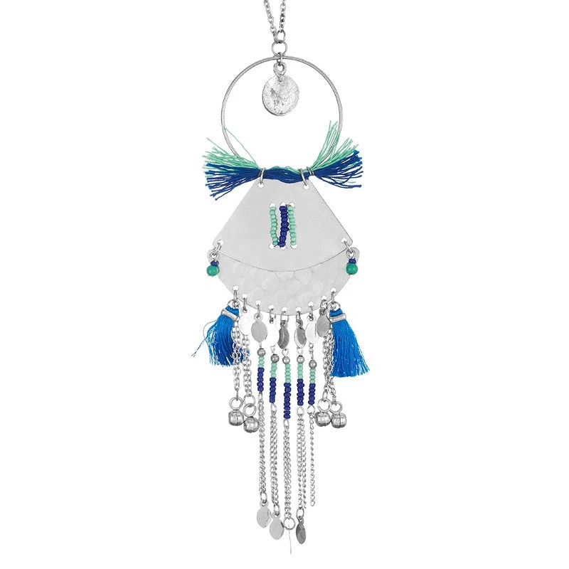 Κολιέ μακρύ φο μπιζού με αλυσίδα, χάντρες και φούντα σε μπλε-ασημί χρώμα - Διαστάσεις: 90εκ.