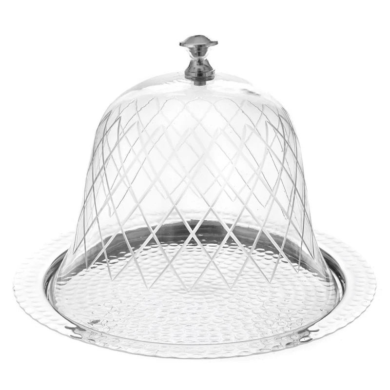 Πιατέλα σερβιρίσματος μεταλλική ασημί στρογγυλή με γυάλινη διάφανη καμπάνα από την iliadis - Διαστάσεις: 30x25εκ.
