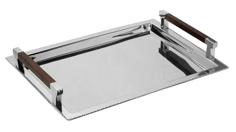 Ορθογώνιος δίσκος σερβιρίσματος, ανοξείδωτος σε ασημί χρώμα με ξύλινα χερούλια από την Espiel - Διαστάσεις: 49x37χ9εκ.