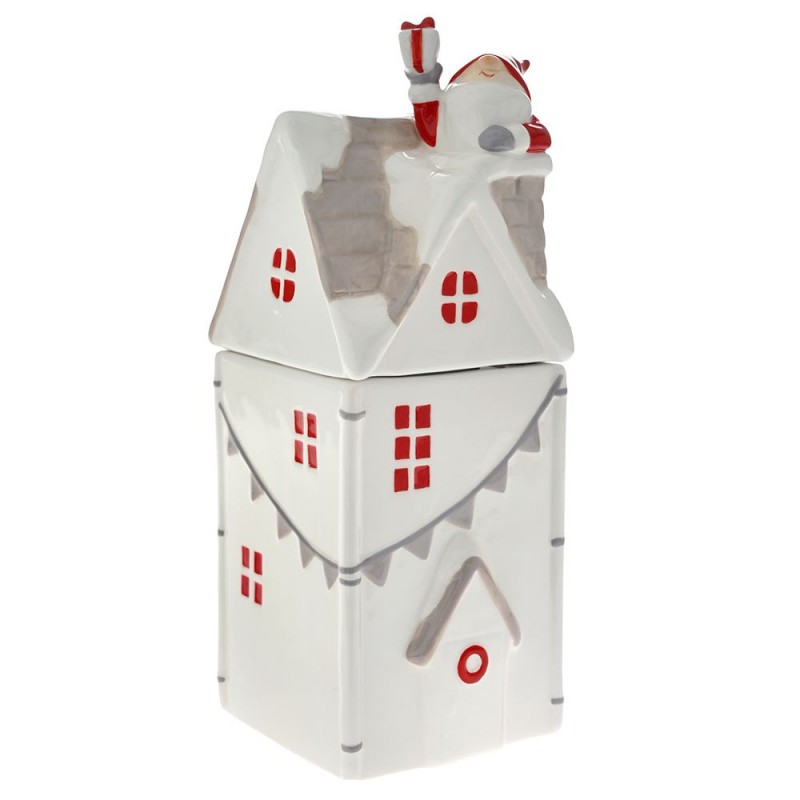 Χριστουγεννιάτικη μπισκοτιέρα κεραμική σε σχήμα σπίτακι σε λευκό - κόκκινο χρώμα από την iliadis - Διαστάσεις: 11x11x28εκ.