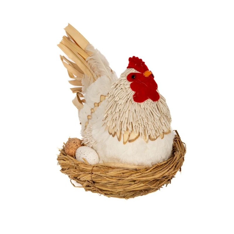 Πασχαλινή διακοσμητική κότα καθιστή σε φωλιά με αυγά σε λευκό χρώμα από την iliadis - Διαστάσεις: 41x28x29εκ.