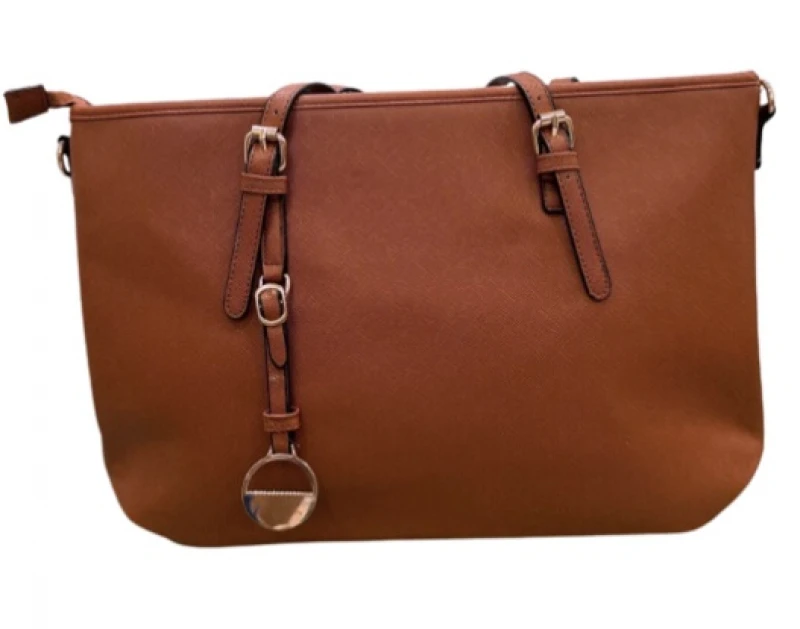Τσάντα γυναικεία ώμου δερματίνη σε καφέ χρώμα με χρυσές λεπτομέρειες. Διαθέτει 1 κύριο χώρο, 2 εσωτερικές θήκες μπροστά για κινητά και διάφορα αντικείμενα και εσωτερική θήκη με φερμουάρ. Επίσης 1 εξωτερική πίσω θήκη με φερμουάρ και 1 λουρί για χιαστί και πλήρως φοδραρισμένο εσωτερικό - Διαστάσεις τσάντας: 45x29,5εκ. και με το χερούλι φτάνει 53εκ. ύψος.