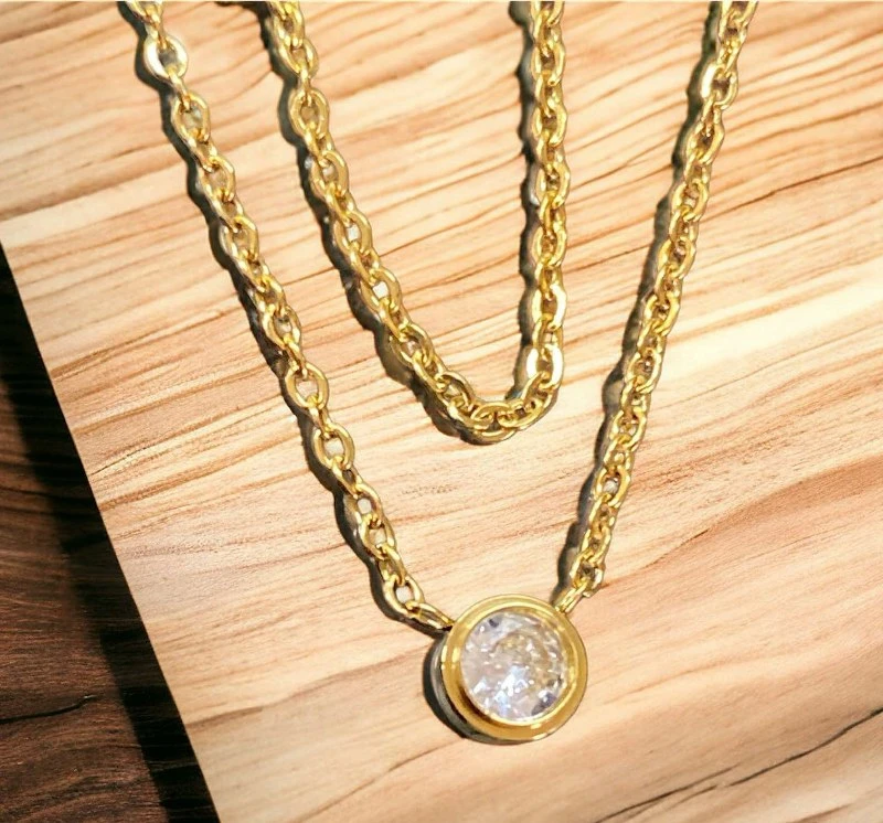 Κολιέ με διπλή αλυσίδα από ανοξείδωτο ατσάλι σε χρυσό χρώμα με στρογγυλό σχέδιο και ιριδίζον στρας.