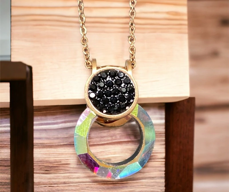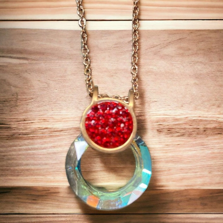 Κολιέ με αλυσίδα σε ροζ-χρυσό χρώμα, διπλής όψεως με πετρούλες ιριδίζον σε μαύρο από την μία πλευρά και κόκκινο από την άλλη πλευρά και στρογγυλό σχέδιο.