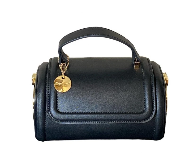 Τσαντάκι βαρελάκι δερματίνης σε μαύρο χρώμα με χρυσές λεπτομέρειες. Διαθέτει έναν ενιαίο χώρο εσωτερικά, θήκη πίσω με φερμουάρ και φαρδύ λουρί πάχους 4εκ. - Διαστάσεις: 20,5x12,5x12,5/20εκ.