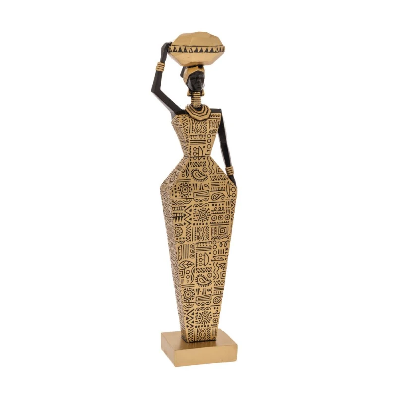 Διακοσμητική επιτραπέζια γυναικεία φιγούρα Αφρικάνας polyresin σε μαύρο χρώμα με χρυσό ανάγλυφο φόρεμα και στάμνα από την iliadis - Διαστάσεις: 8x6x32εκ.
