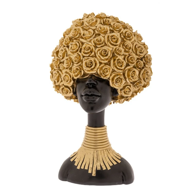 Διακοσμητική επιτραπέζια γυναικεία φιγούρα Αφρικάνας polyresin σε μαύρο χρώμα με χρυσά λουλούδια στα μαλλιά και χρυσό κολιέ από την iliadis - Διαστάσεις: 27x15x41εκ.